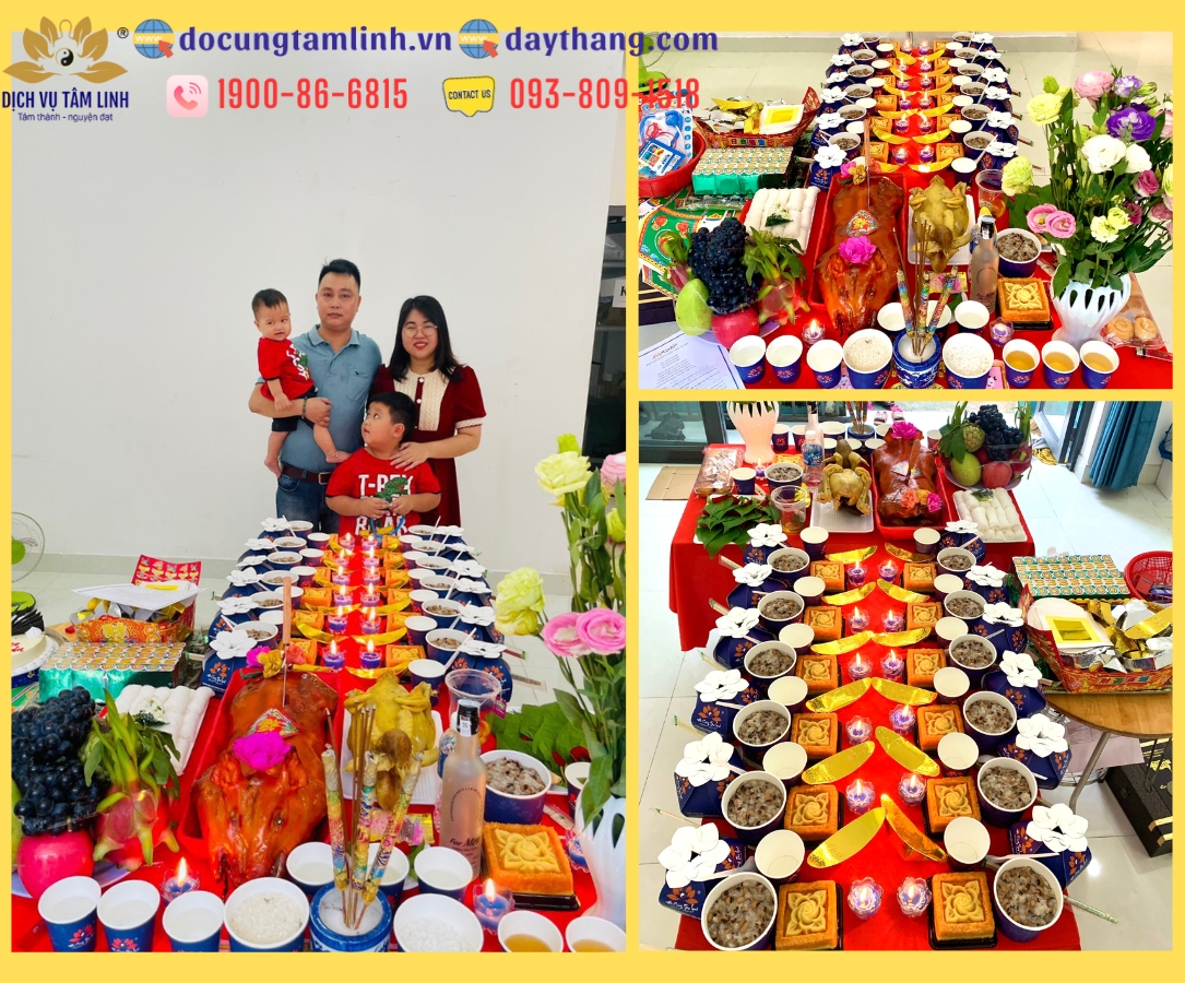 Cách sắp đồ cúng lên bàn: Sắp lên 2 bàn: 1 bàn nhỏ ở phía trên sẽ bày đồ cúng cho Đức ông, 1 bàn lớn phía dưới bày lễ cúng 12 bà Mụ. Trong đó, bàn trên được đặt cách bàn dưới một khoảng 10 cm. Nguyên tắc khi sắp mâm cúng đó là “Đông bình Tây quả” tức là phía Tây bạn đặt lễ vật còn phía Đông đặt bình bông. Lưu ý là các mâm được bài trí một cách cân đối và đầy đủ các lễ vật đã nêu ở trên.