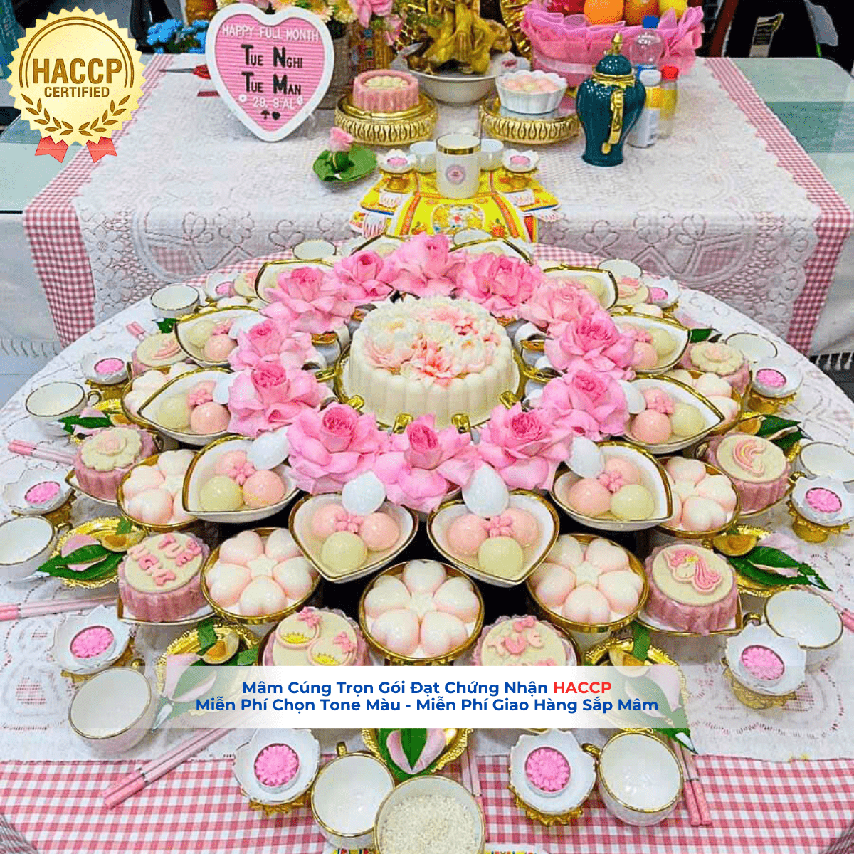 Đối với bé gái, mâm cúng đầy tháng cũng mang ý nghĩa quan trọng không kém. Ngoài các lễ vật truyền thống, việc lựa chọn hoa quả, bánh kẹo tươi tắn, màu sắc tươi sáng cũng được cân nhắc kỹ lưỡng. Màu sắc chủ đạo thường là màu hồng, trắng, thể hiện sự dịu dàng và tinh khôi. Bạn có thể đặt mâm cúng đầy tháng bé gái tại các dịch vụ uy tín ở Tân Phú để đảm bảo sự hoàn chỉnh và tinh tế cho buổi lễ.