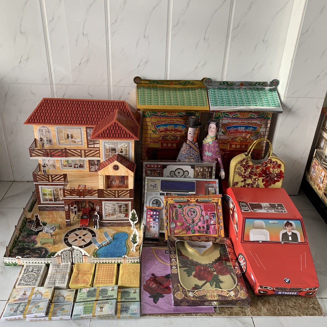 - Tiền Việt, Tiền USD, Tiền Euro, Xu vàng, Xu Bạc, Thiên Y, Thiên khối, Vãng sanh, Vàng thỏi, giấy cúng đầy đủ