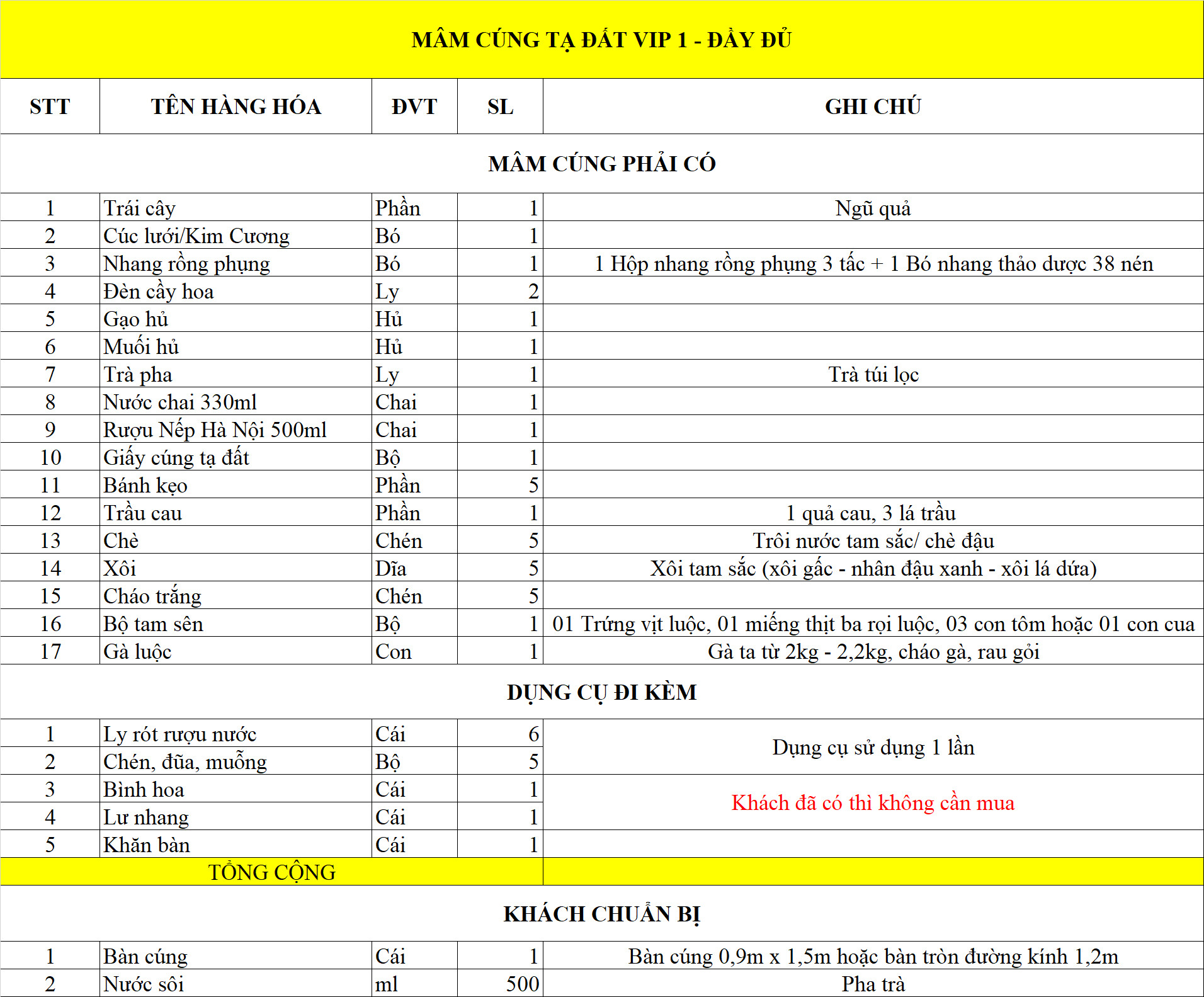 Nhang, đèn, gạo muối, giấy tiền vàng bạc, bánh kẹo, hoa quả, 6 miếng trầu cau, sáu điếu thuốc, 6 chung nước, …. (vật thực – tùy tâm).
